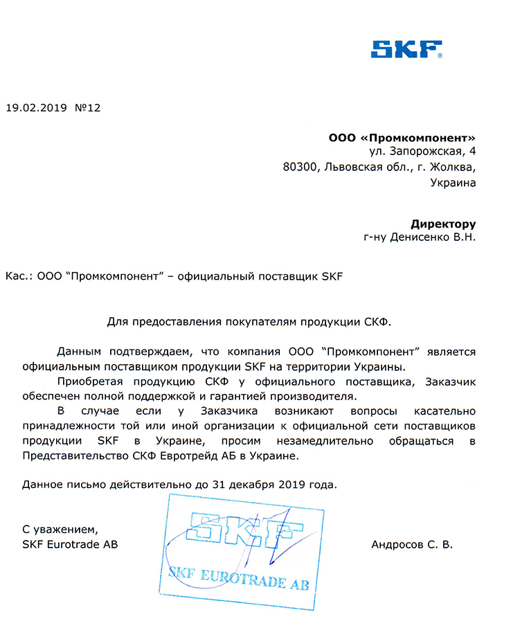ТОВ «Промкомпонент» є офіційним постачальником продукції SKF на території України. Концерн SKF (Швеція) - компанія інженерних рішень та найбільший виробник підшипників. В компетенцію компанії входить надання технічної підтримки та послуг по техобслуговуванню, діагностиці та навчанню. Сьогодні SKF приділяє увагу розвитку п’яти платформ свого бізнесу: підшипники і підшипникові вузли, ущільнення, мехатроніка, технічні послуги, системи змащування. В структурі SKF нараховується 6 підрозділів: промисловий, автомобільний, електротехнічний, сервісний, авіаційний і підрозділ по виробництву сталі. У SKF – репутація виробника високоякісних підшипників, концерн працює по усьому світу та дотримується найвищих стандартів якості виготовлення продукції. Особливу увагу компанія SKF приділяє екологічній безпеці у виробництві, розвитку нових енегрозберігаючих технологій. Ця співпраця дає можливість замовникам отримати безпосередній доступ до іновацій і рішень SKF.